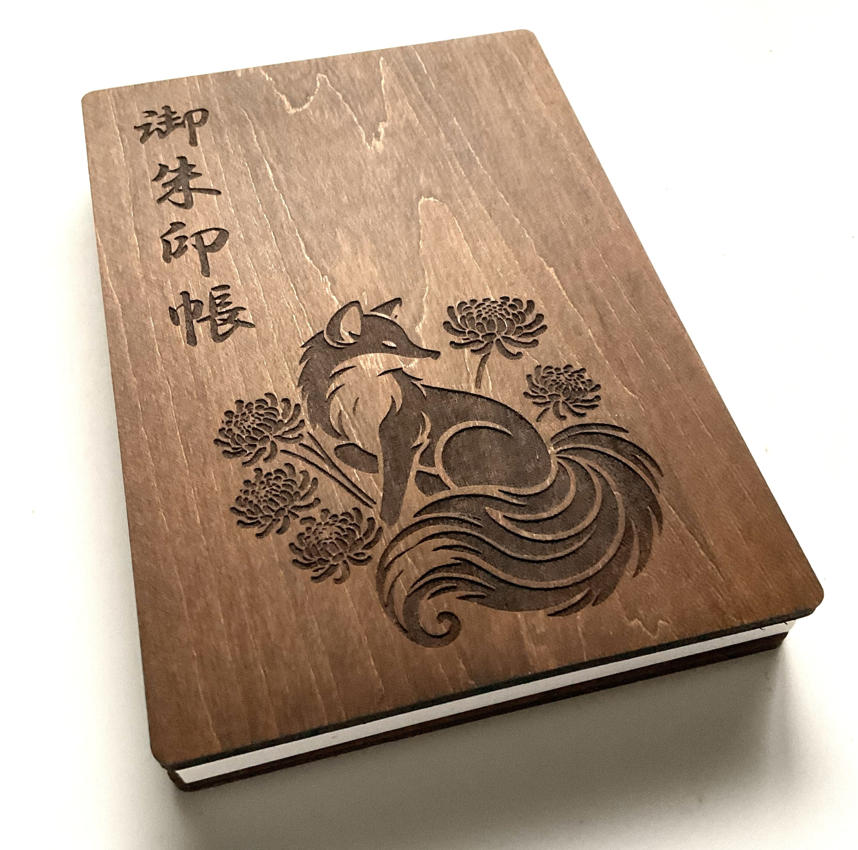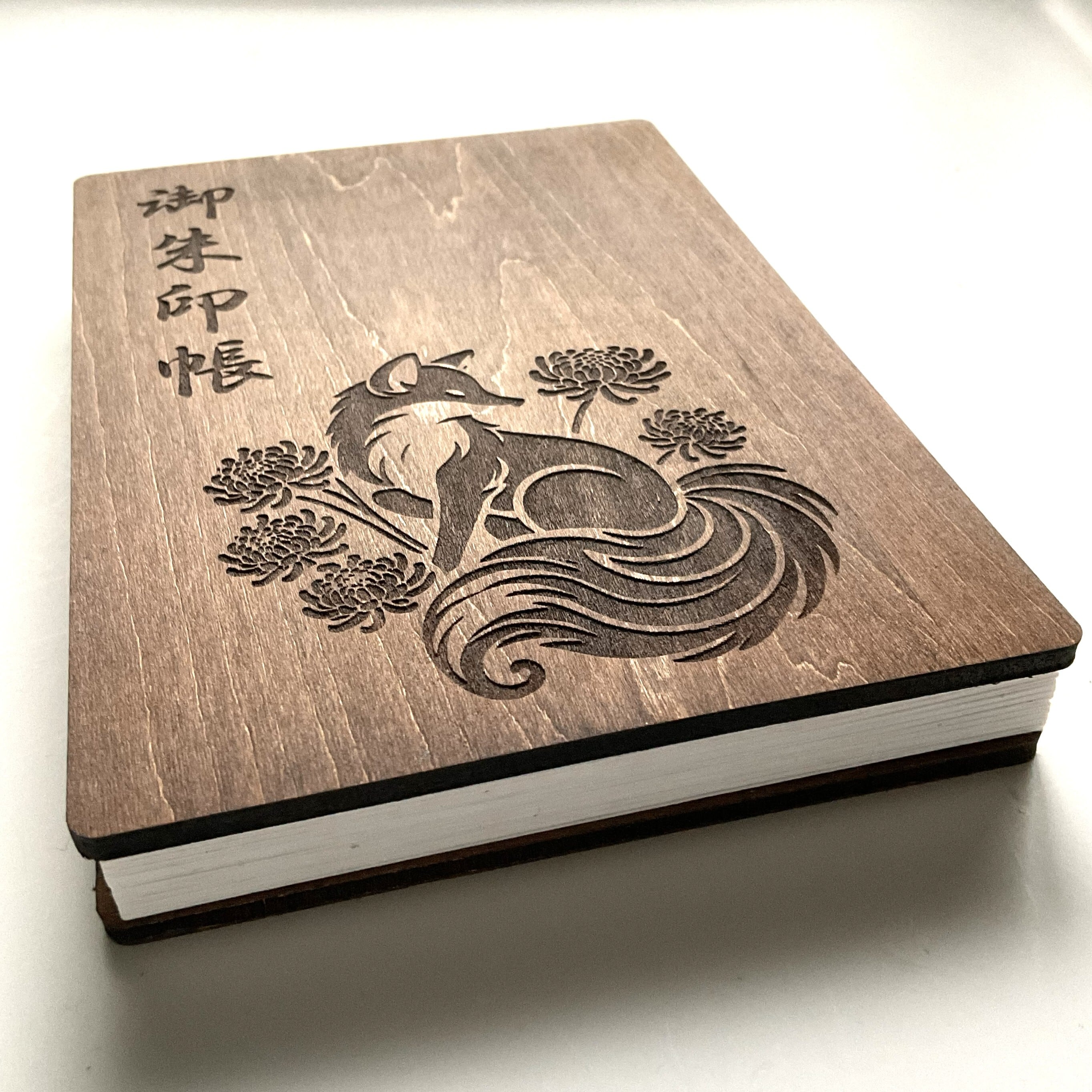 「狐と菊」をオリジナルデザインで刻印した木製御朱印帳です。
