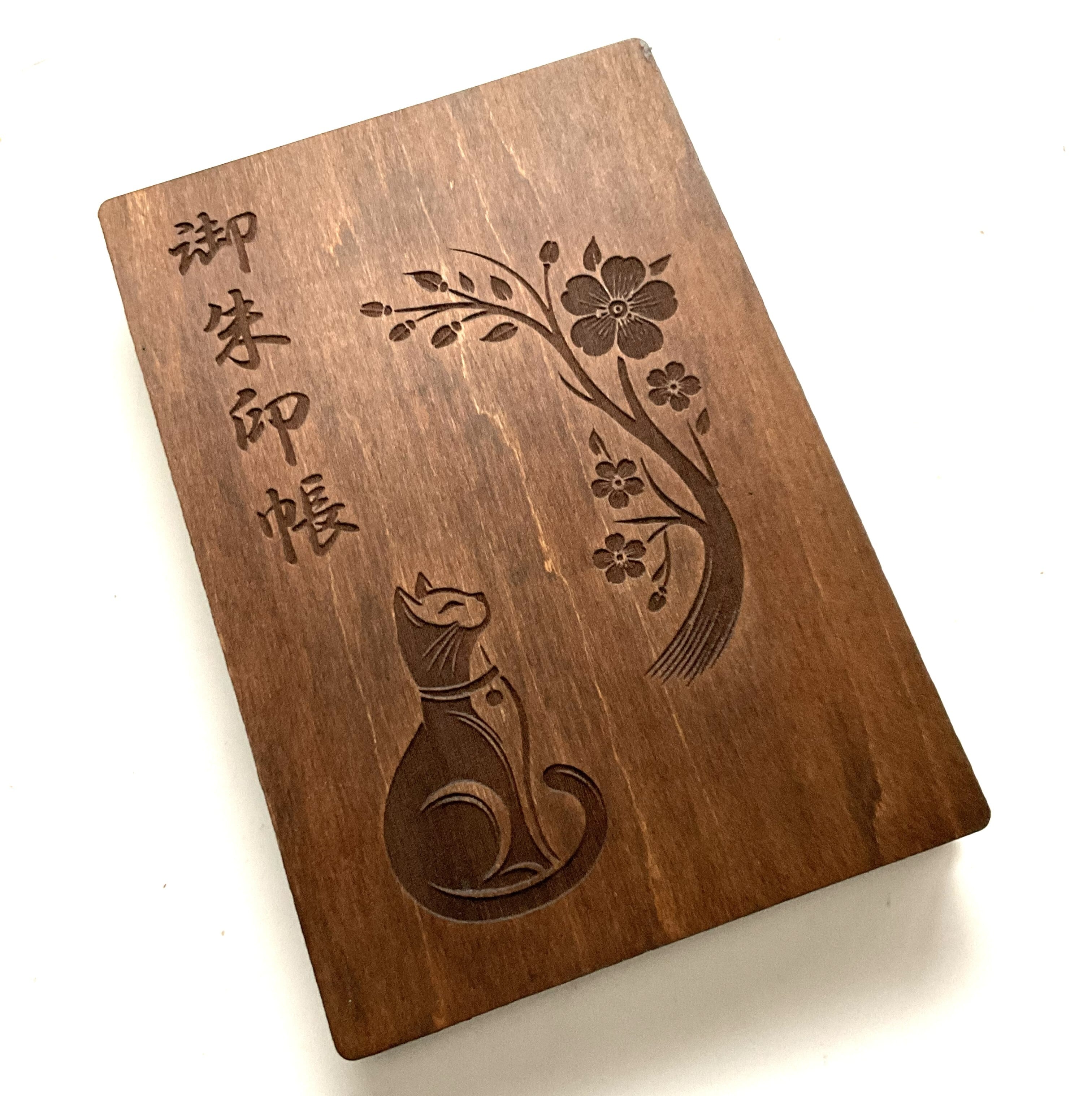 「桜の木の下」で「お花見をする猫」をオリジナルデザインで刻印した木製御朱印帳です。