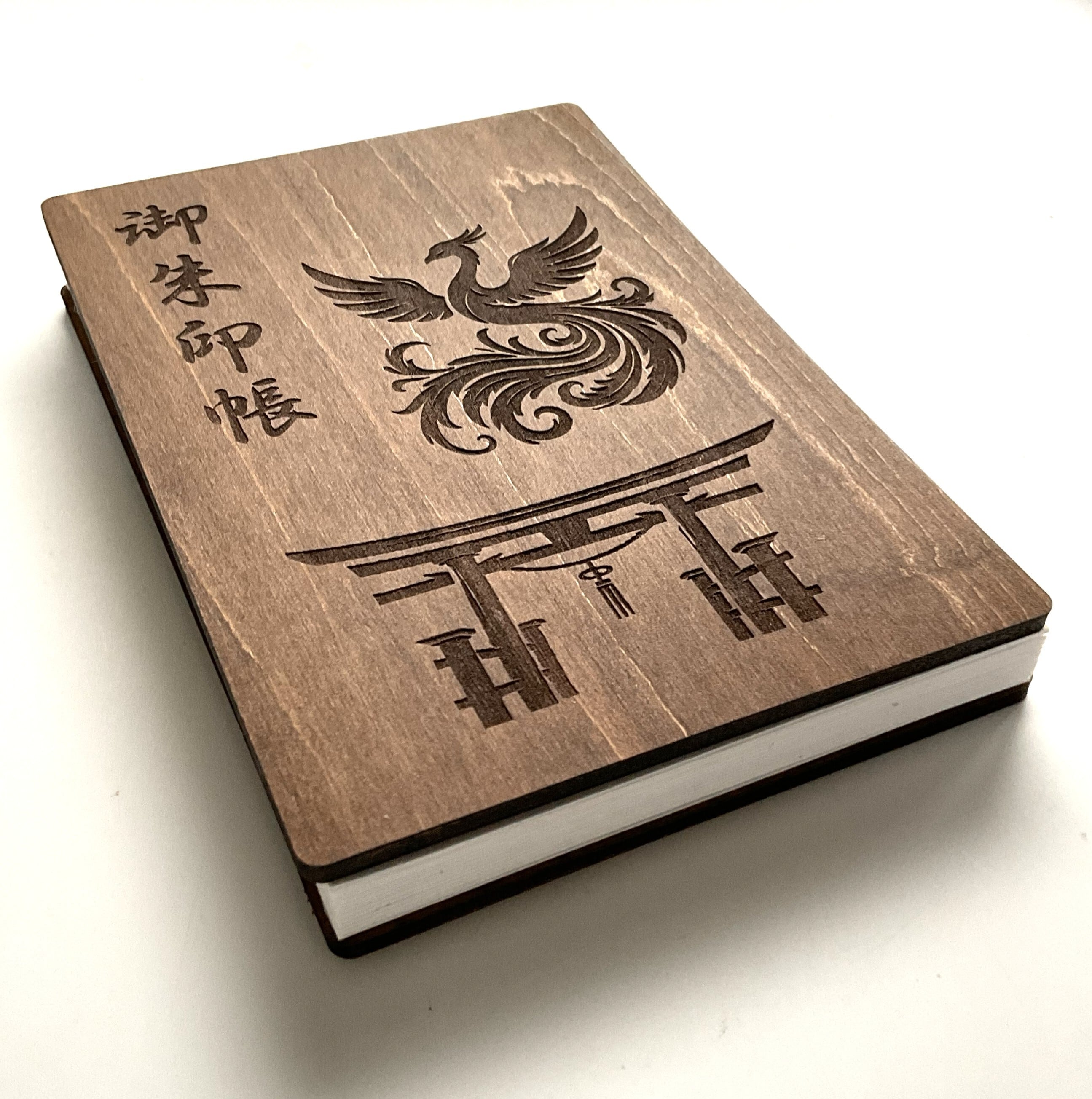 生命と輪廻転生の象徴「鳳凰」が、神域と現世の境界線の「鳥居」上空を飛んでいる様子をオリジナルデザインで刻印した木製御朱印帳です。
