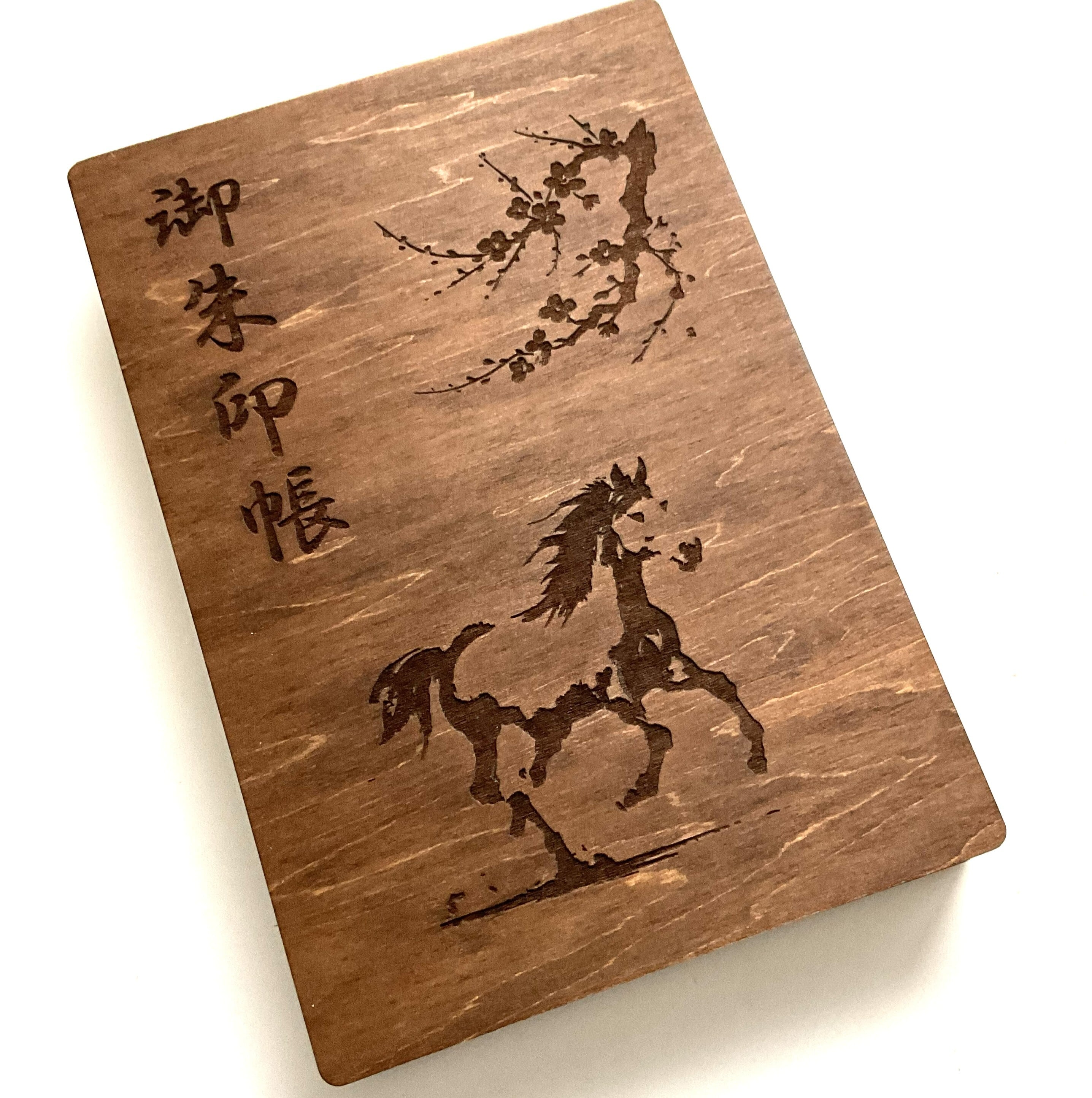 「馬と桜」をオリジナルデザインで刻印した木製御朱印帳です。