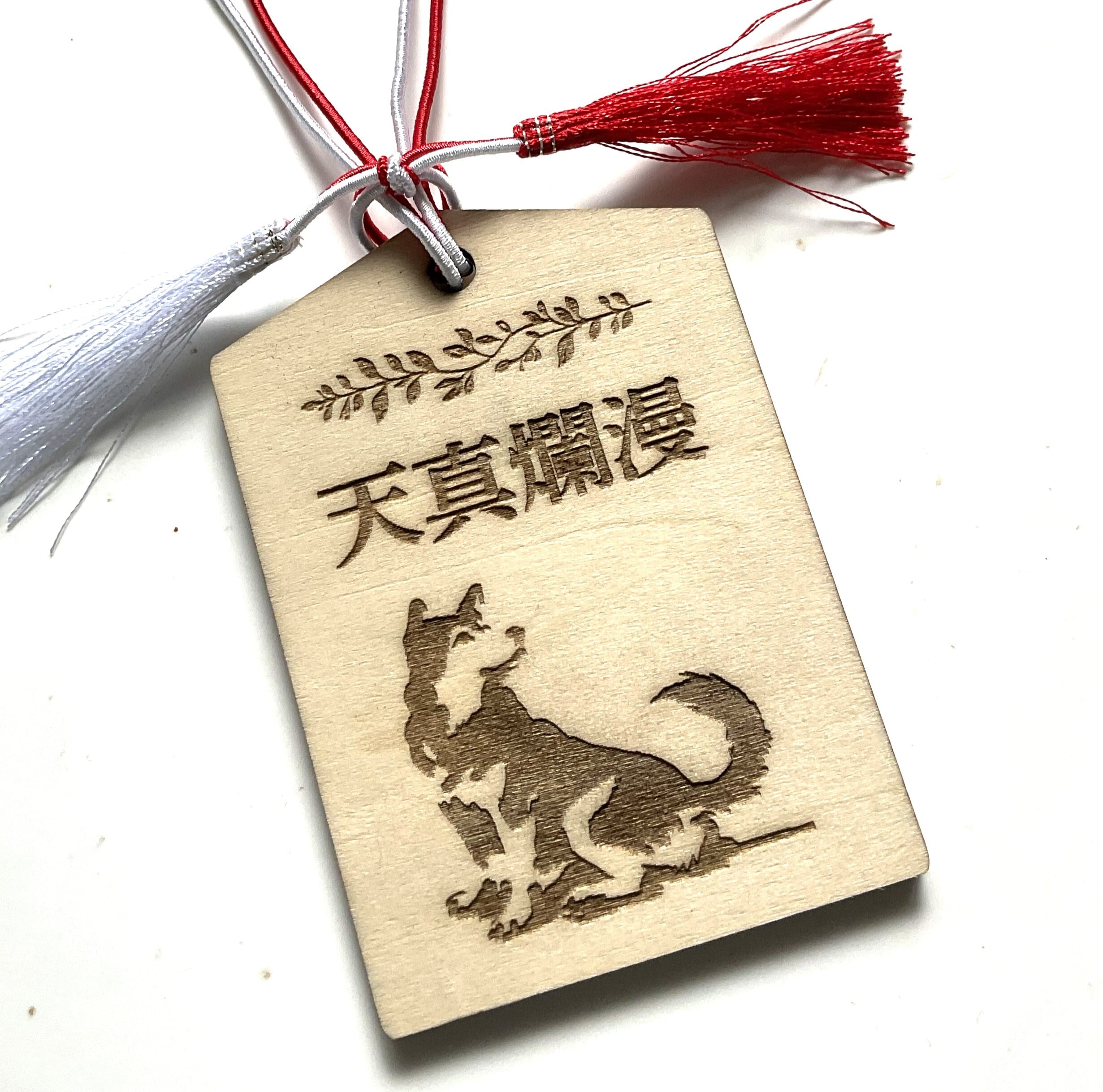 オリジナルデザインの「飼い主を振り返る犬」がモチーフに刻印された木製お守りです。