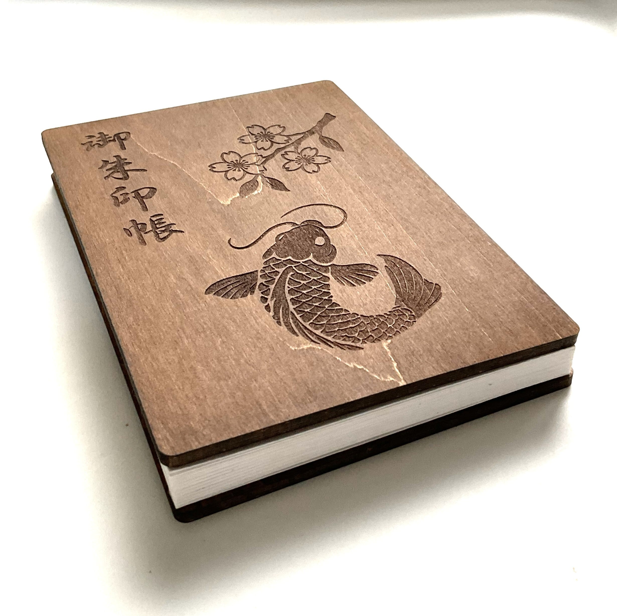 「鯉と桜」をデザインした木製御朱印帳です。