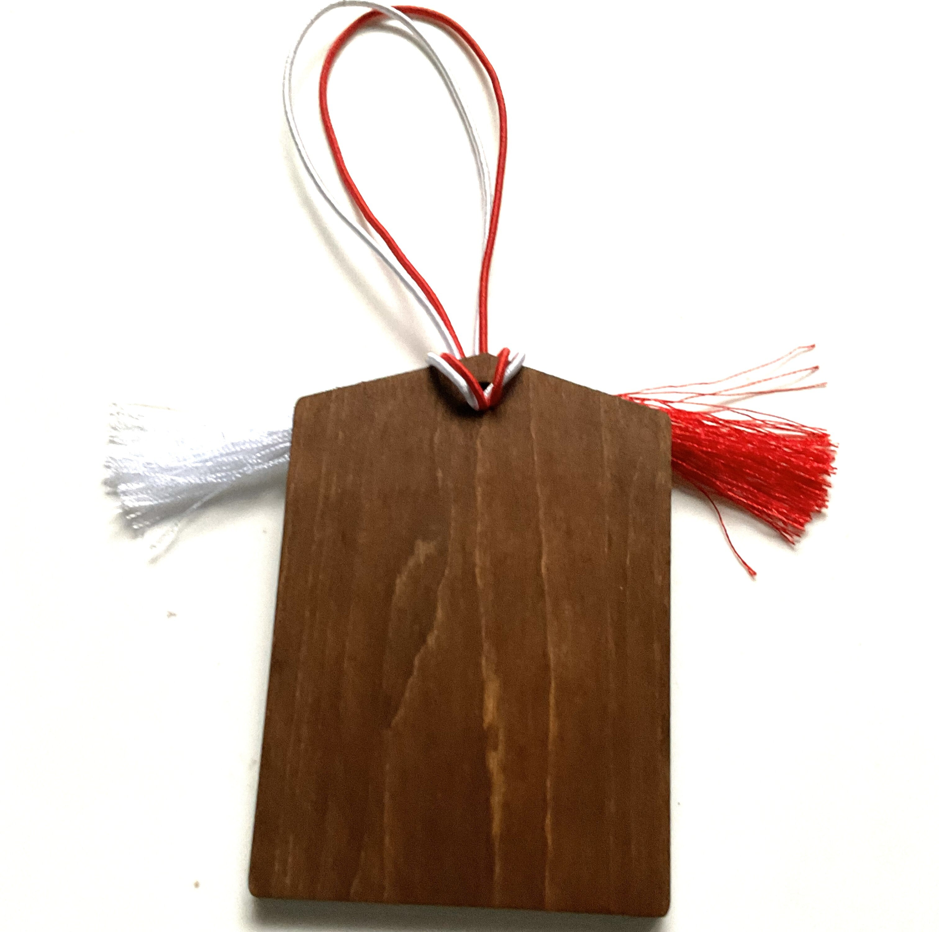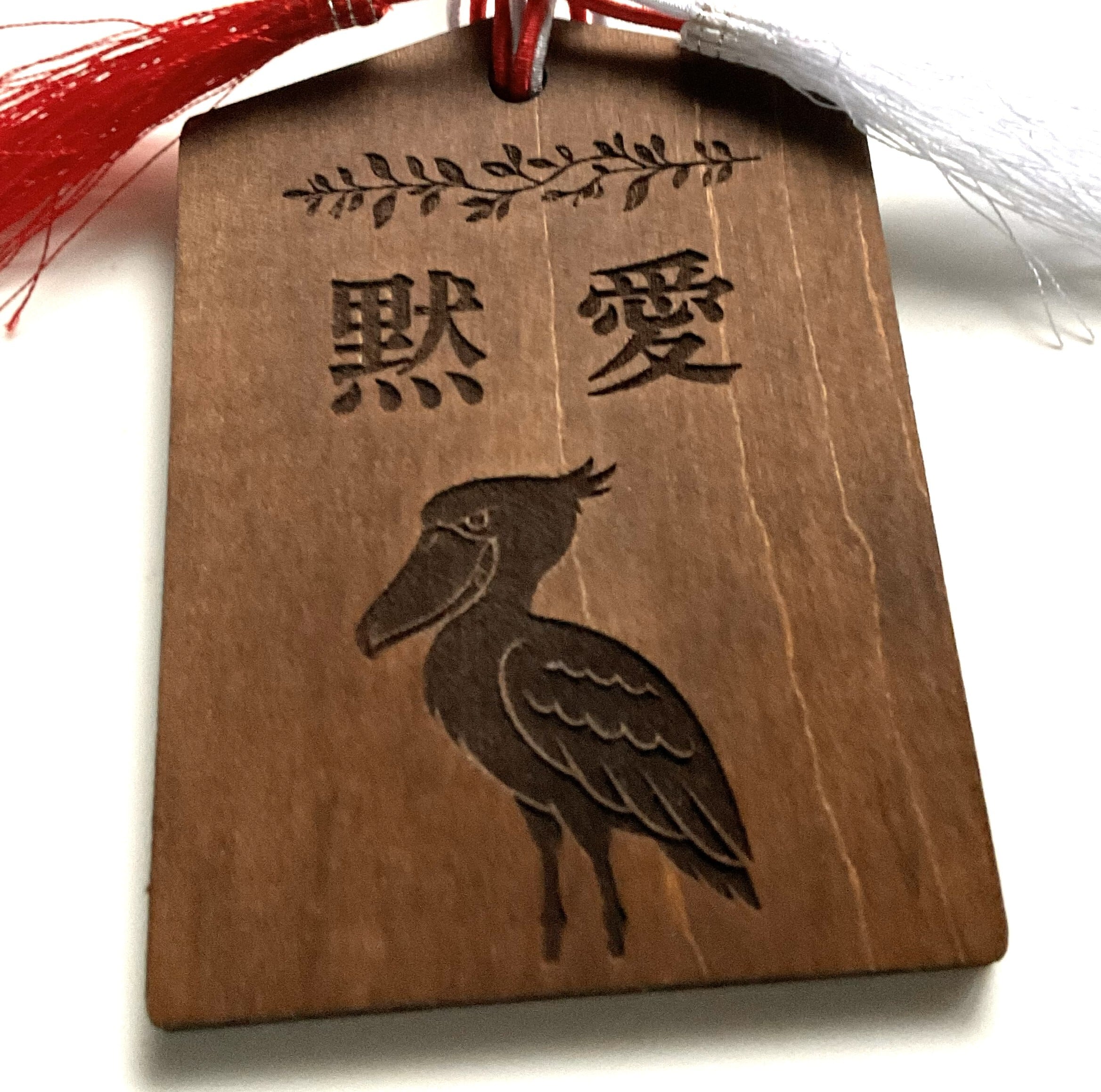 ハシビロコウのモチーフが描かれた木製お守りです。
