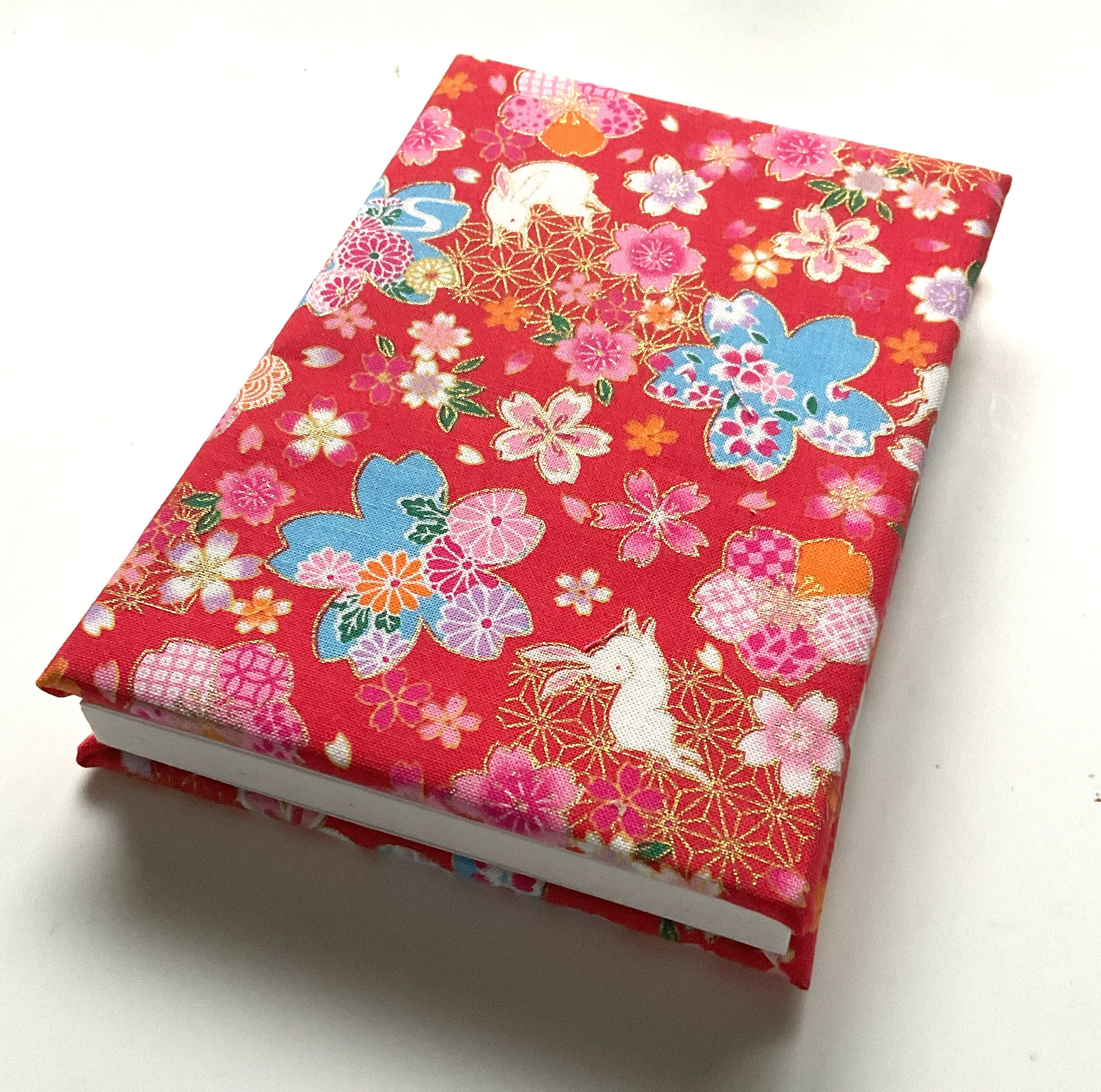 満開の桜が咲き誇る中で、楽し気に飛び跳ねている「和風」テイストのウサギを描いた生地で、木製御朱印帳を一つ一つ手作業で包み込みました。(新生地になりました!)