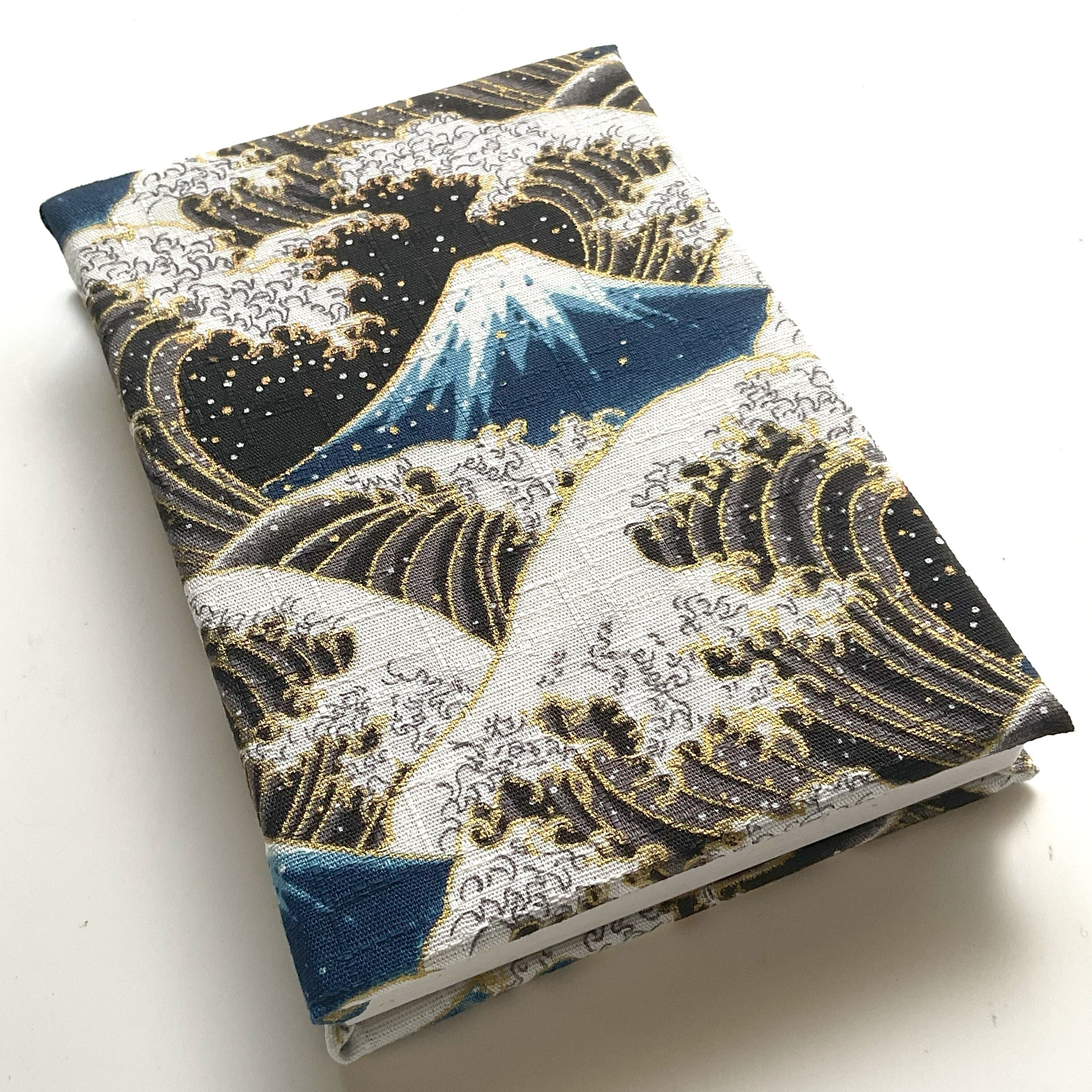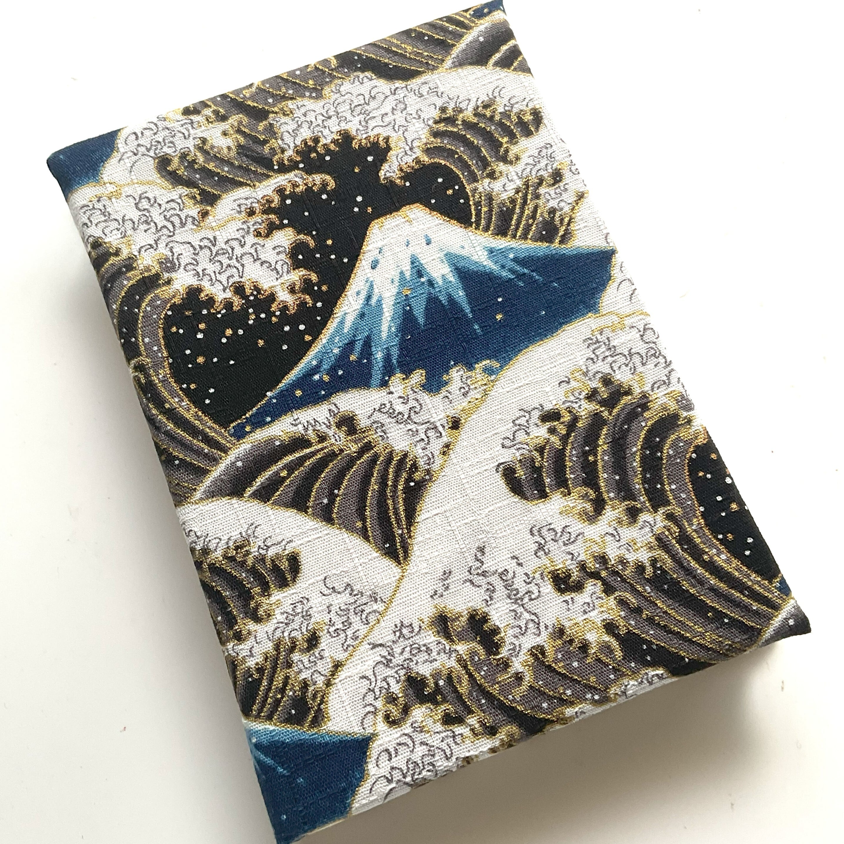 日本の象徴「富士山」と葛飾北斎の冨嶽三十六景を思わせる「大波」が描かれた生地で、木板を包んだハンドメイドの御朱印帳です。